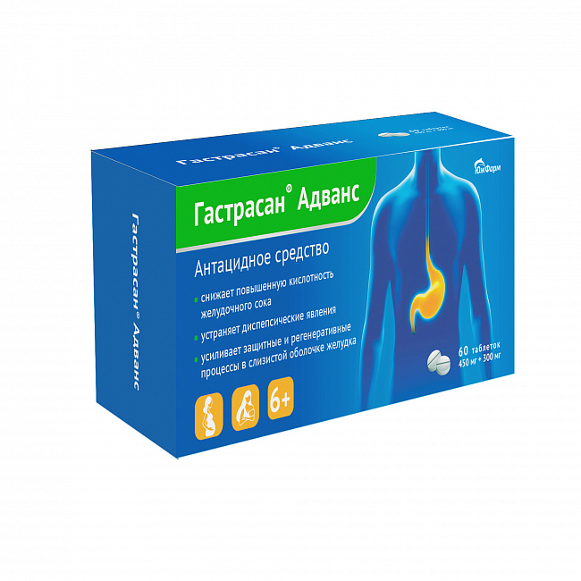 Торговое наименованиеГастрасан® АдвансМНН (международное непатентованное наименование) или группировочное наименованиеАлюминия гидроксид-магния карбонат + Магния гидроксидЛекарственная форма и дозировкаТаблетки для рассасывания, 450 мг+300 мгПоказания к применениюГастрасан® Адванс показан к применению у взрослых и детей в возрасте от 6 до 18 лет. диспепсические явления, такие как: дискомфорт или боль в эпигастрии, изжога, кислая отрыжка после погрешностей в диете, избыточного употребления алкоголя, кофе, никотина и т.п.; диспепсические явления, такие как: дискомфорт или боль в эпигастрии, изжога, кислая отрыжка (и их профилактика), возникающие в результате применения некоторых лекарственных препаратов (нестероидные противовоспалительные препараты, глюкокортикостероиды и др.); состояния, сопровождающиеся повышенным кислотообразованием: язвенная болезнь желудка, гастрит, рефлюкс-эзофагит, грыжа пищеводного отверстия диафрагмы. Условия отпускаБез рецепта